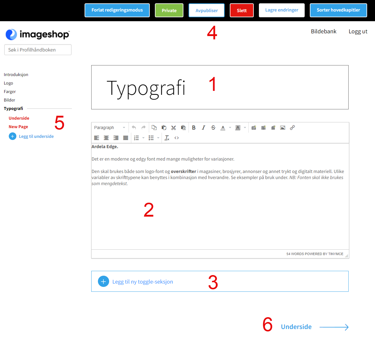 You can also add a toggle section (3), which you can read more about below. When you're done editing, you can change the settings of the chapter at the top of the page (4). Here you can save the changes, delete the chapter, publish and unpublish it, and decide if the chapter should be private or public. In the column on the left side of the page you can navigate between chapters (5), and at the bottom of the page you can navigate to the next chapter (6).
