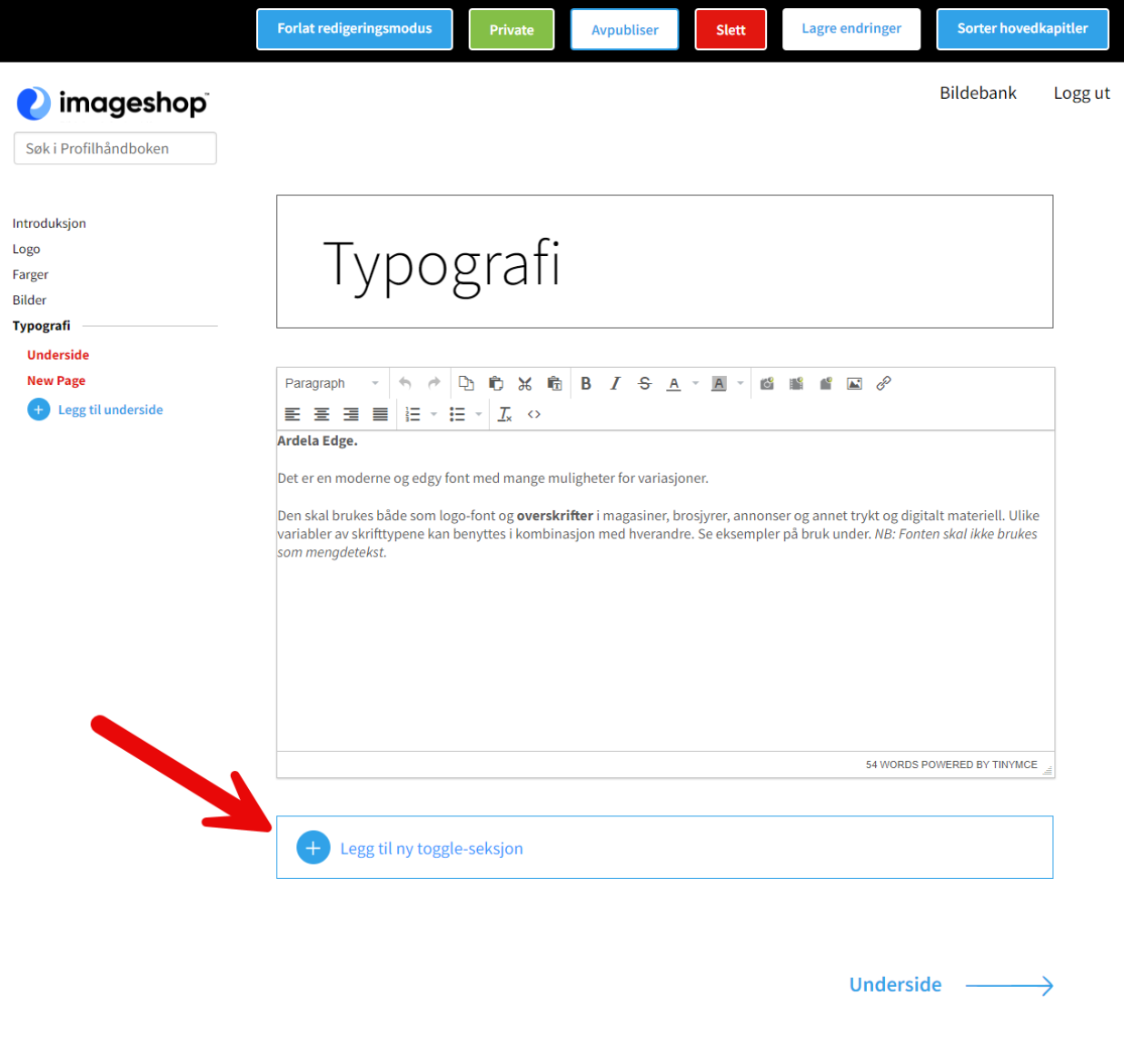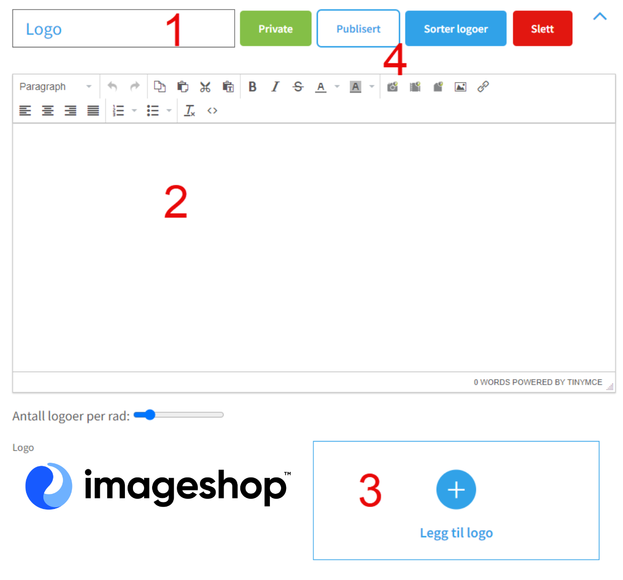 2. When you're making a toggle section, you can edit the heading (1), the content (2), and add logos (3). When you've finished editing, you can decide if the toggle section should be private or public, publish it, and sort logos at the top (4). Here you can also delete the toggle section.