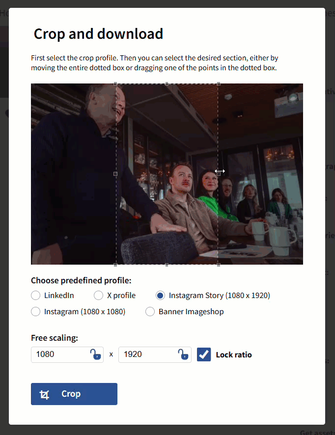 - Choose one of the predefined cropping profiles or enter the correct pixel sizes under "Free scaling".