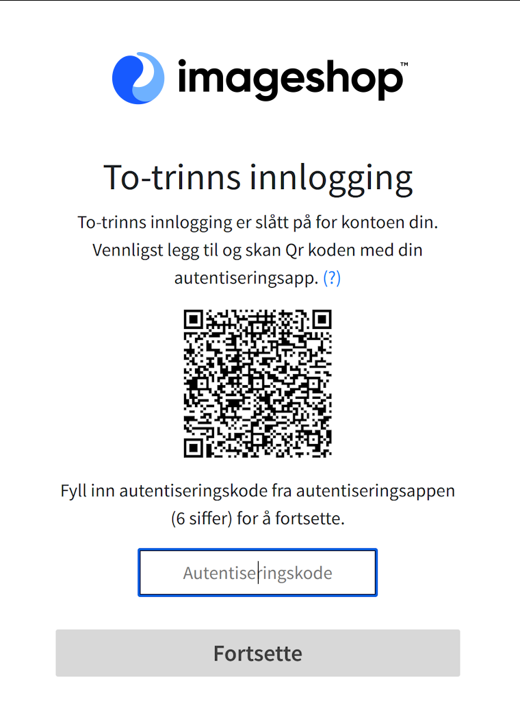 Hvis MFA er aktivert for noen av disse, vil brukere som er omfattet få beskjed om å scanne en QR-kode etter at de har skrevet inn brukernavn og passord neste gang de forsøker å logge seg på Imageshop.