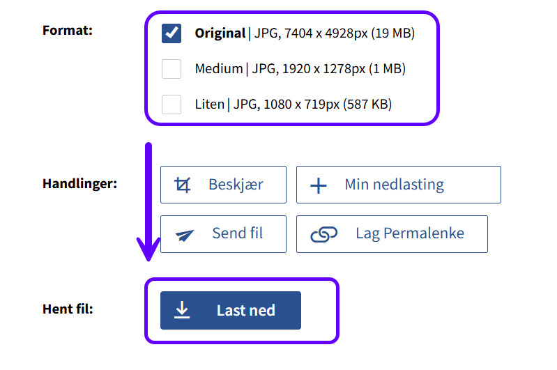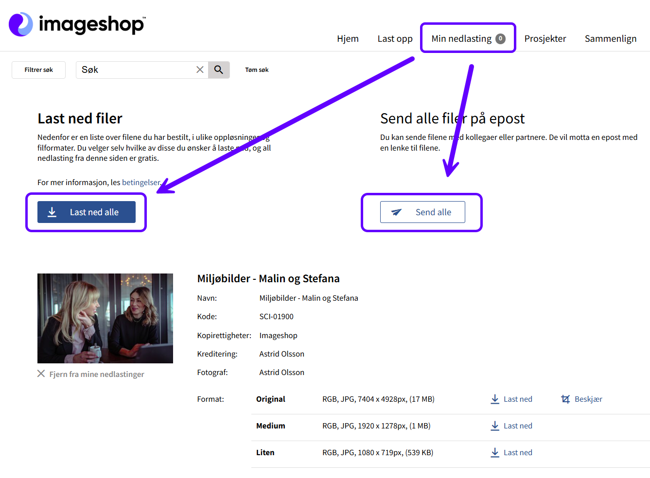 I denne artikkelen finner du en detaljert veiledning for hvordan du laster ned filer i Imageshop. Vi forklarer hvordan du laster ned én enkelt fil, hvordan du laster ned flere filer samtidig, og hvordan du kan samle filer fra ulike kategorier og søk ved hjelp av «Min nedlasting». Du finner også informasjon om hva du gjør dersom den totale nedlastningen overstiger 800 MB.